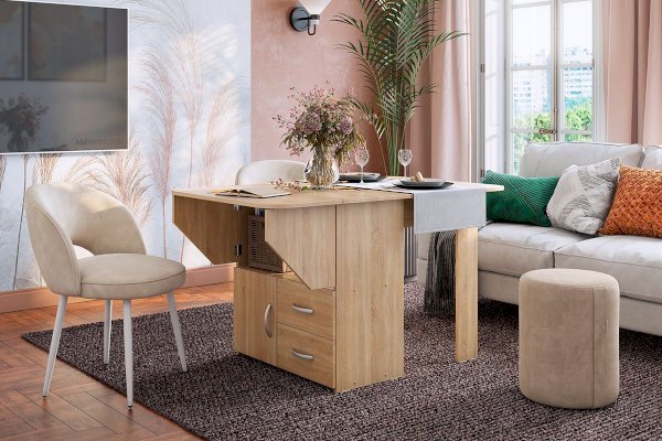 Как здорово собраться всей семьей за обедом! Есть прекрасный вариант – это «Стол-тумба». В разложенном виде за столом разместится до 4 человек. Тумба под столом позволяет хранить кухонную утварь в 2 выдвижных ящиках и шкафу.