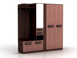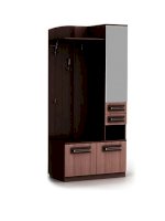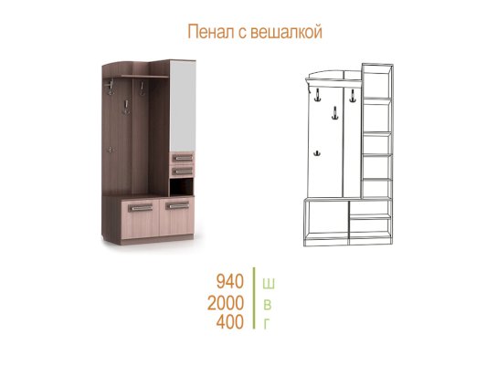 Отличительные особенности прихожей — функциональный дизайн и современные оттенки текстур. Конструкция данной модели включает в себя все необходимое: зеркало, шкаф, пенал, вешалки, ящики и множество полок для различных мелочей.